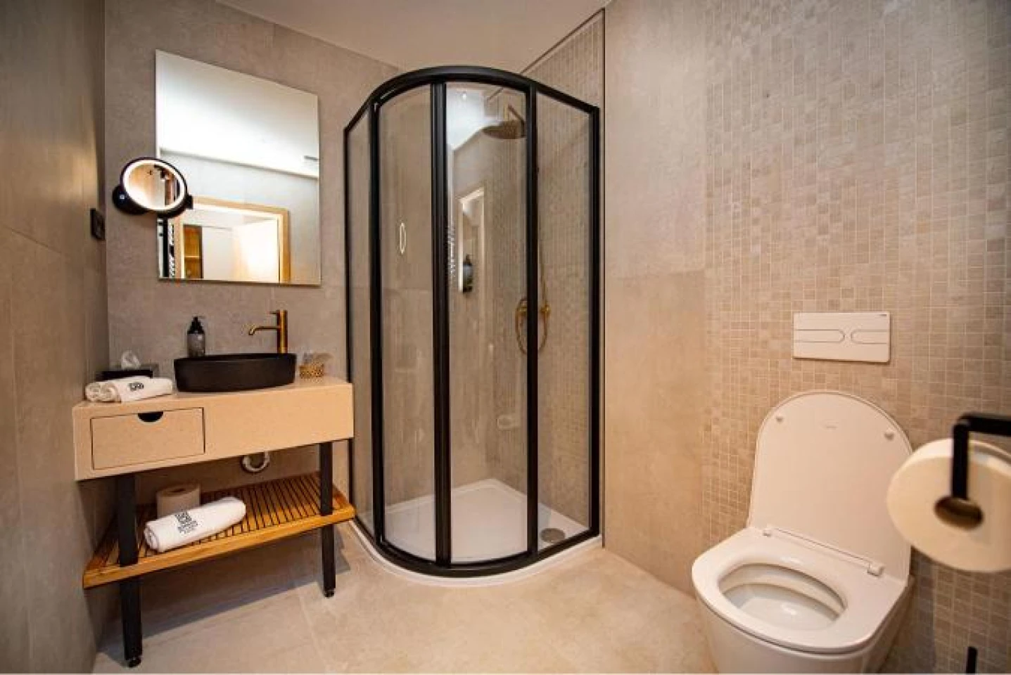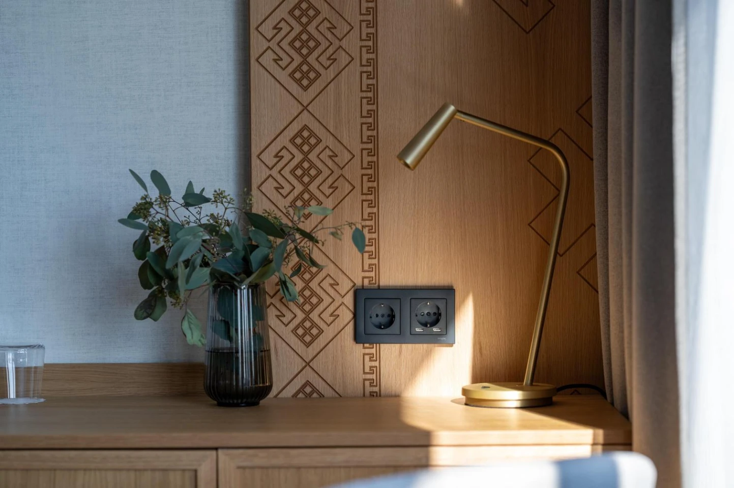 Located on the ground floor of the newly built wing, this exclusively furnished room with a built-in shower, modern furnishings and views of the pool, garden and water.